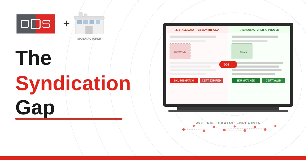 Manufacturer-to-distributor product content syndication is one of the most fragmented workflows in industrial distribution. Each distributor endpoint has its own data templates, its own taxonomy rules, its own upload cadences, its own onboarding process. When you update a spec, rewrite a description, or add a certification, there is no guaranteed mechanism to confirm that update reached every endpoint in the right format, at the right time.